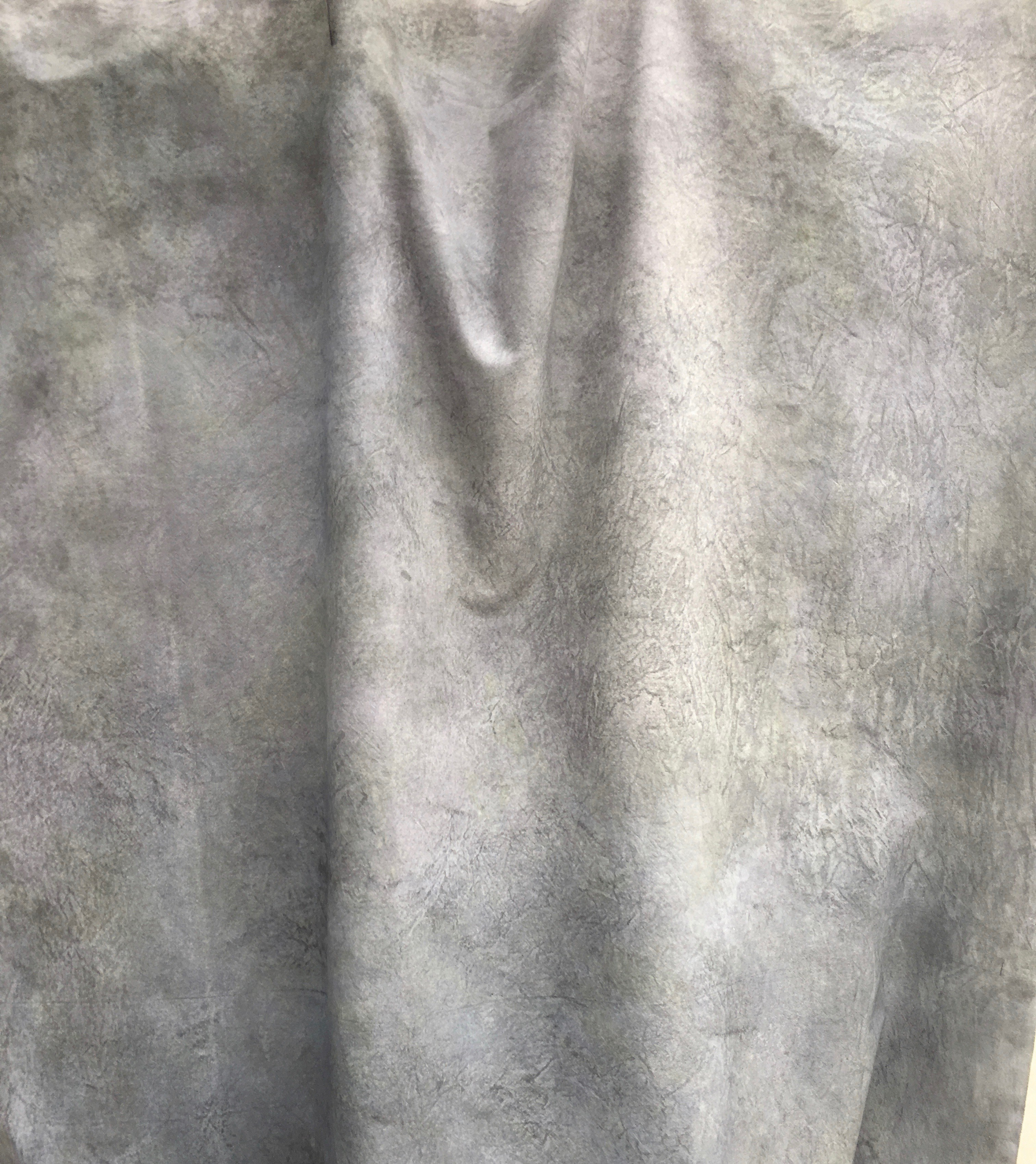 2-sidig, tvättbar/vaskeekte bakgrund. Den ena sidan har mörkare grålila botten med inslag av svagt gult. Den andra sidan har ljusgrå botten med spräckliga, marmorerade mönster i mörkare grått, och svaga nyanser av lila och ljusgult.